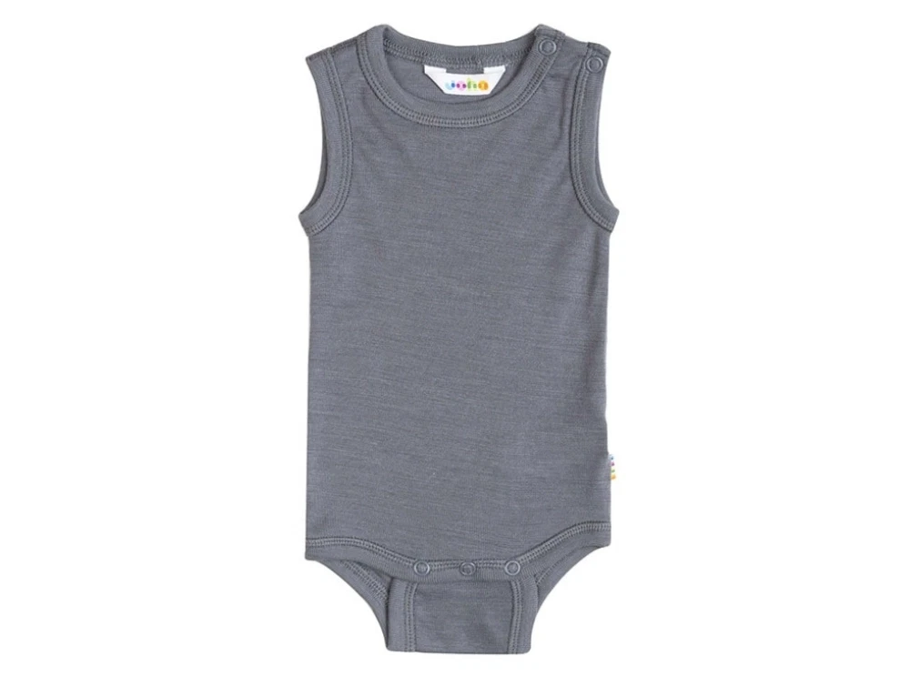 Grå body uden ærmer i en blød blanding af merinould og silke fra Joha. Modellen er fremstillet i 85% merinould og 15% silke, hvilket giver en let, blød og strækbar kvalitet. Trykknapper på begge skuldre og mellem benene gør den nem at tage af og på.
