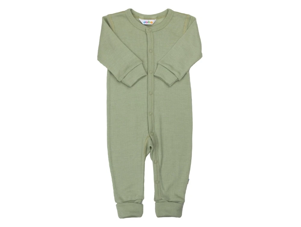 Ulddragt i grøn nuance fra Joha med 2-i-1 fod og trykknapper foran samt ned gennem det ene ben, som gør påklædningen nem.