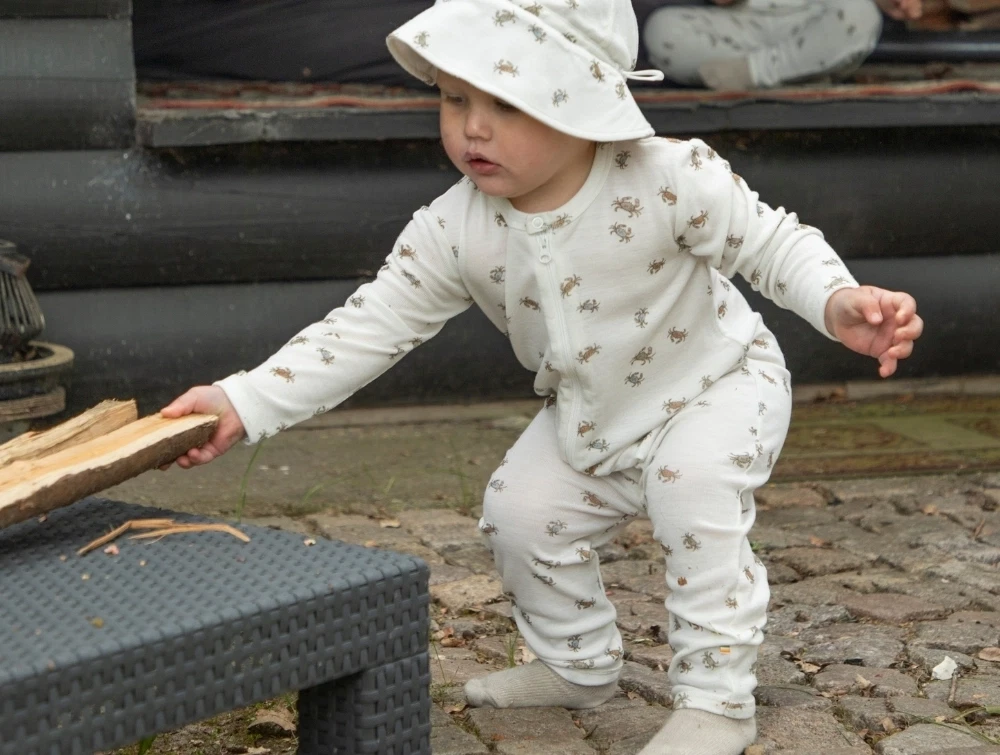 Barn iklædt Joha heldragt i råhvid nuance med krabbeprint i uld og silkeJoha heldragt i råhvid nuance med krabbeprint i uld og silke