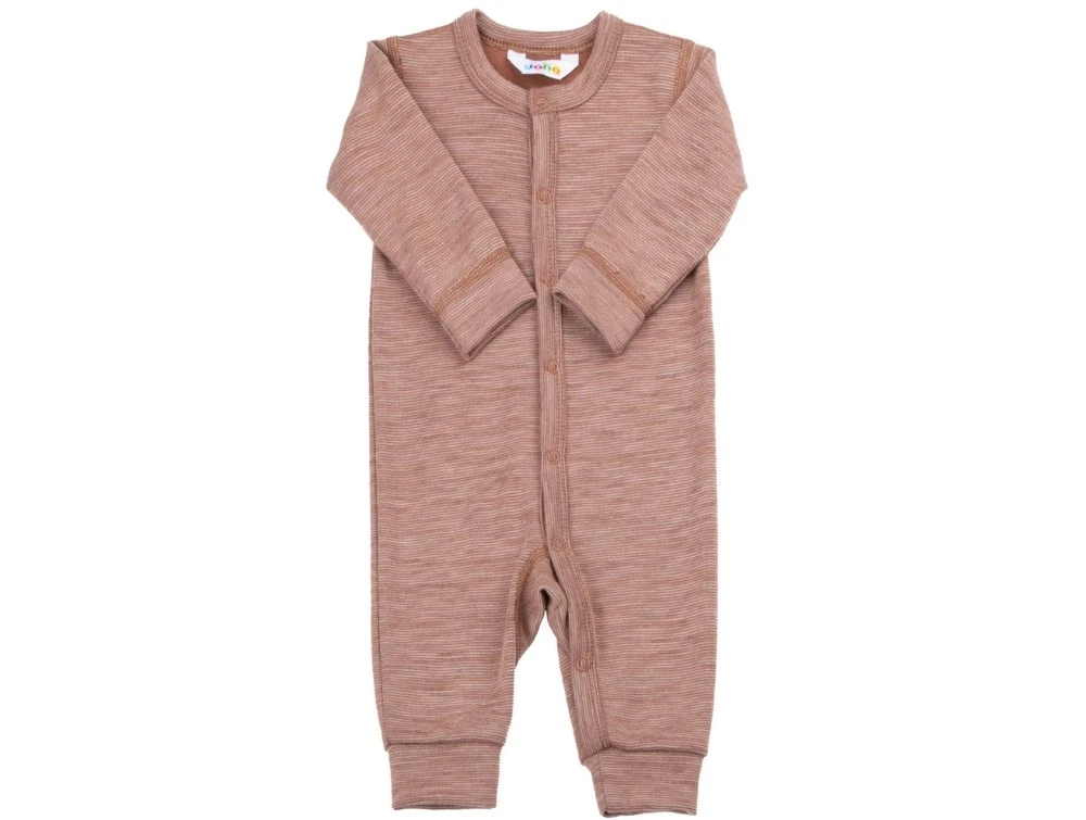 Uldens naturlige egenskaber gør dragten temperaturregulerende og åndbar, så barnet holdes varmt i koldt vejr og køligt på varmere dage. De fine smalle striber giver et enkelt og klassisk udtryk.