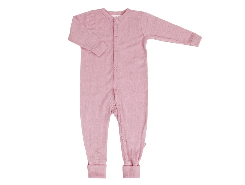 Rosa ulddragt i let merinould fra Joha. Modellen er fremstillet i en blød og elastisk kvalitet med lodret rillemønster, der gør den behagelig for barnet at have på. Dragten lukkes med trykknapper hele vejen ned gennem det ene ben, hvilket gør påklædning og bleskift nemt. De praktiske 2-i-1 fødder kan foldes op eller ned efter behov.
