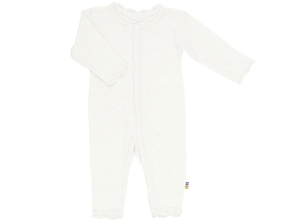 Jumpsuit i råhvid nuance fra Joha. Fremstillet i en blød blanding af 85% merinould og 15% silke, certificeret med OEKO-TEX®. Modellen har trykknapper foran og fine blondekanter ved hals, ærmer og ben.