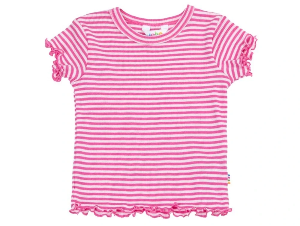Kortærmet t-shirt fra Joha i en fin ribstrikket kvalitet med klassiske pink og hvide striber. Modellen har en rund halsudskæring, overlockede kanter forneden og på ærmerne samt en blød, fleksibel pasform.