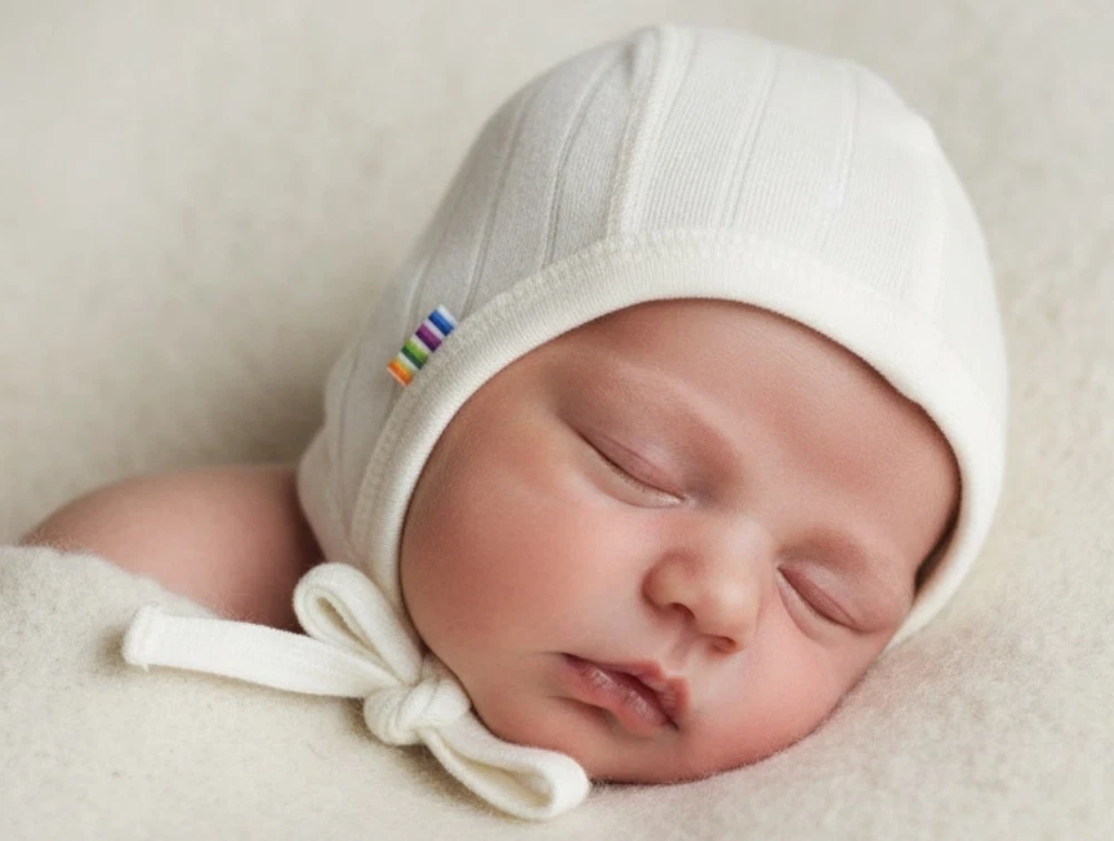 Babyhjelm i farven natur med et enkelt lag uld fra Joha.