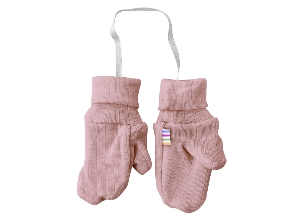 Vanter i old rose nuance fra Joha i blød merinould. Modellen har tommelfinger og er forbundet med en hvid snor, så de ikke bliver væk, når barnet har dem på.