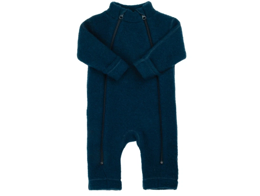 Ulddragt i mørk turkis nuance fra Joha fremstillet i 100% børstet merinould. Dragten har dobbelt lynlås foran, som gør den nem at tage af og på, samt vendbare fødder og hænder, der kan foldes ud eller ind efter behov.