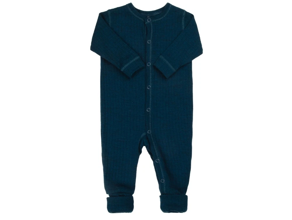 Ulddragt i mørk turkis nuance fra Joha fremstillet i 100% merinould. Dragten har lange ærmer og praktisk lukning med trykknapper hele vejen ned gennem det ene ben. Den har desuden 2-i-1 fødder, som kan foldes ud eller ind efter behov.