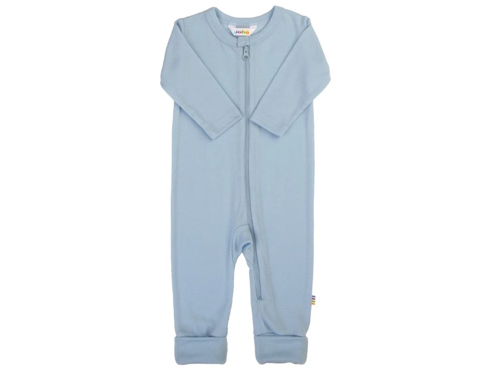 Heldragt i blå nuance fra Joha i blød og let merinould. Denne uldkvalitet har god strækevne og føles behagelig mod huden. Modellen er ensfarvet og har 2-i-1 ombuk i benene, så fødderne kan dækkes efter behov.