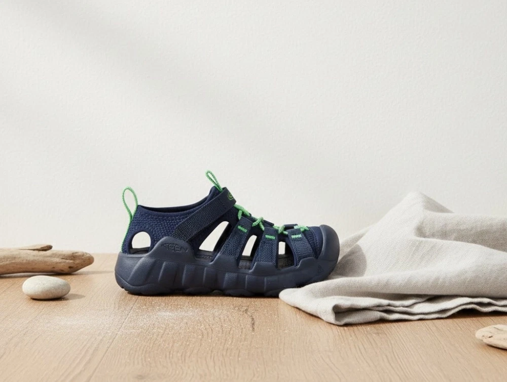 Sandal i blå nuance med grønne detaljer fra KEEN med lukket tå, elastiksnøre og justerbar velcrolukning. Hyperport H2 er en let hybridsandal med hurtigtørrende materialer, blød støddæmpning og en ekstra tyk mellemsål, der giver god komfort til aktive børn.