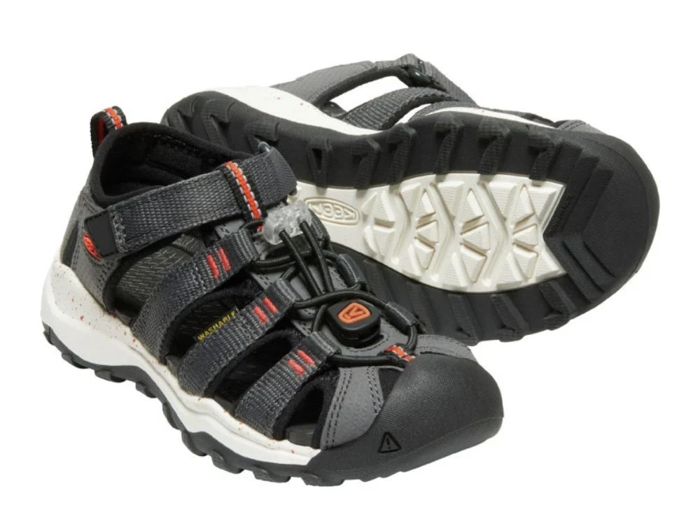 Sporty sandal fra Keen i grå nuancer med orange detaljer – Newport Neo H2 – i letvægtsmaterialer og med en sål, der klarer alle former for terræn.