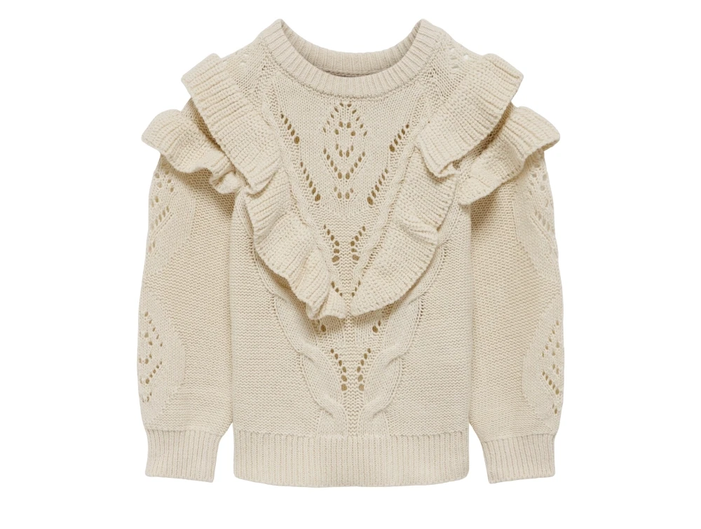Denne lækre striktrøje fra Kids ONLY tilbyder en afslappet og let stil, der er perfekt til hele dagen. Trøjen har en behagelig O-halsudskæring, der sikrer komfort og stil. Pasformen gør den ideel til enhver lejlighed og gør den let at style. Fremstillet af bomuld og akryl i en fladstrikket konstruktion med jacquard-detaljer, hvilket giver et stilfuldt udtryk og samtidig sikrer komfort. Denne striktrøje er et alsidigt stykke tøj, der kan bruges til både hverdagsbrug og mere formelle begivenheder, og den tilføjer et strejf af elegance til enhver garderobe.