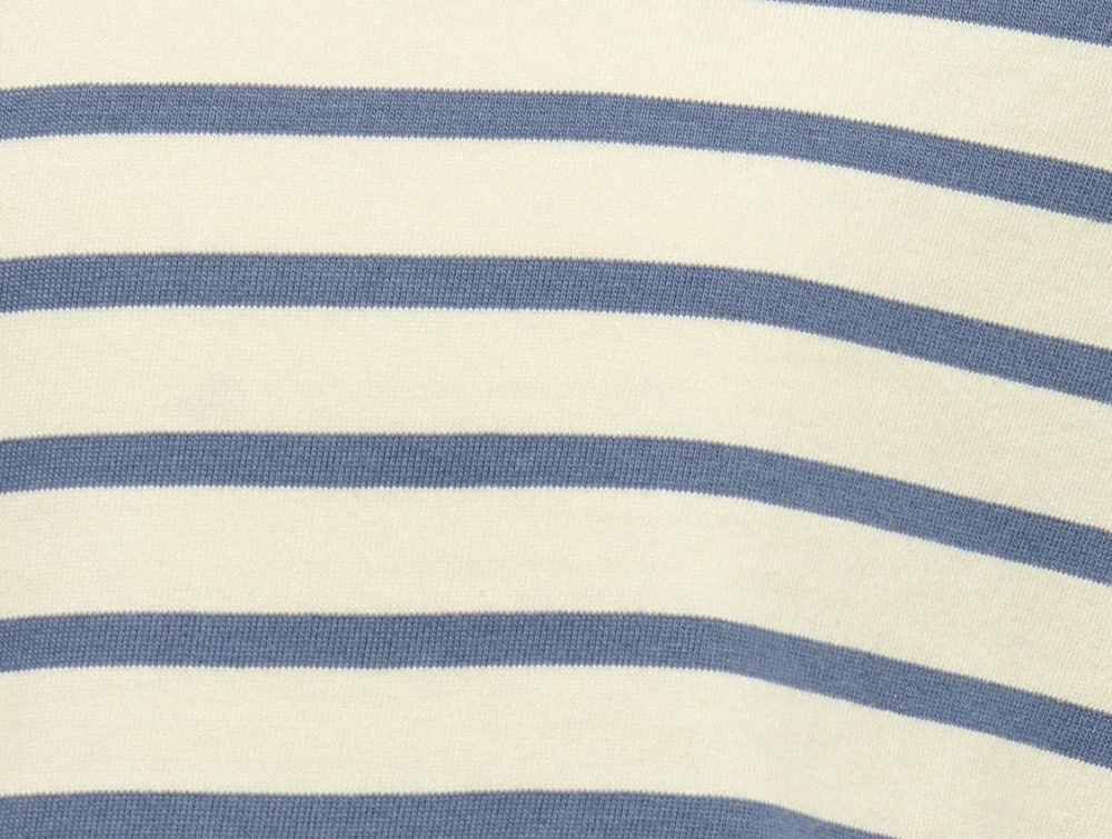 T-shirten har et afslappet look med brede striber og rund halsudskæring. Den er lavet i en blød bomuldskvalitet, der gør den behagelig at have på til både hverdag og afslapning.