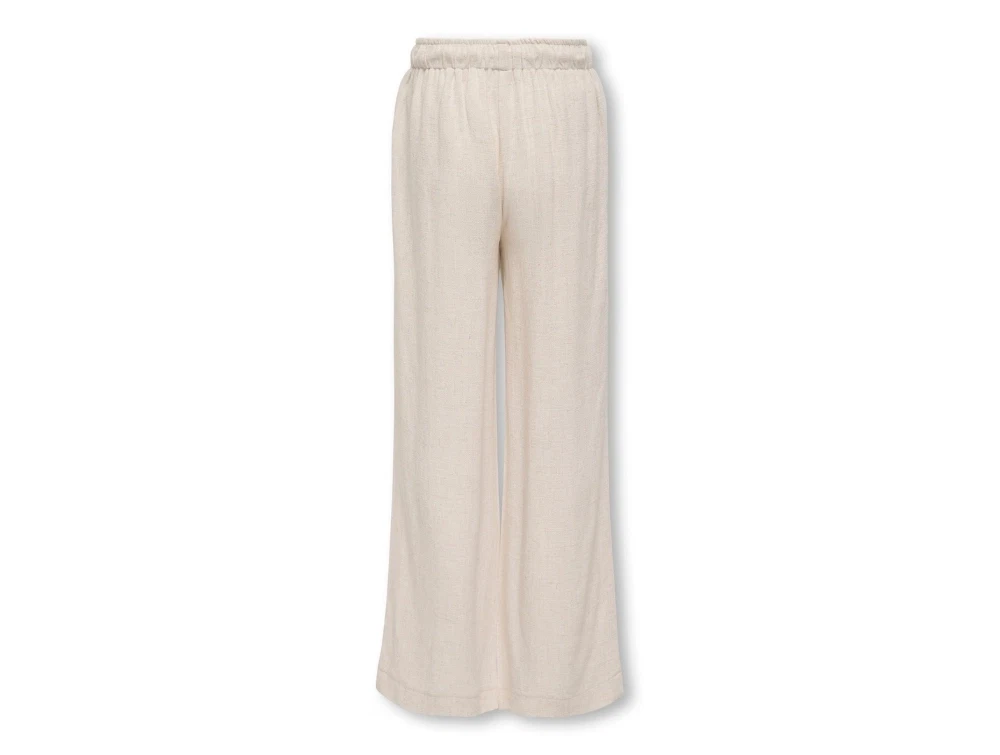 Pige iklædt Kids ONLY bukser i lys beige med snøre og elastik i taljenKids ONLY hørbukser i lys beige med snøre og elastik i taljen set forfraKids ONLY bukser i lys beige med elastik i taljen closeupKids ONLY bukser i lys beige med lige ben set bagfra