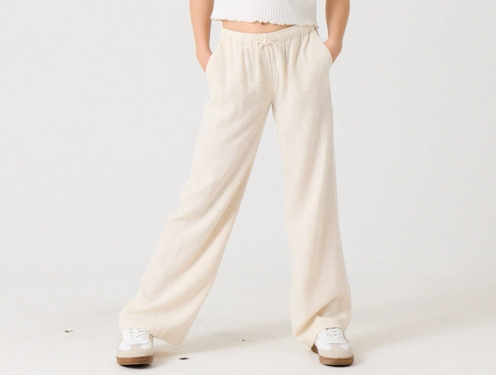 Materialet i viskose og hør giver en let og luftig kvalitet, der føles behagelig mod huden. Stoffet har en naturlig struktur, som gør bukserne velegnede til varmere dage.