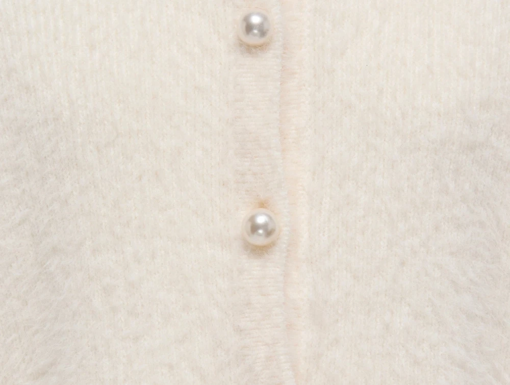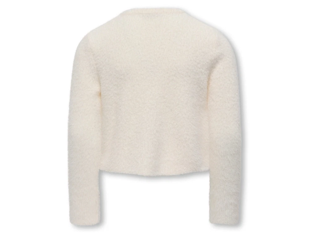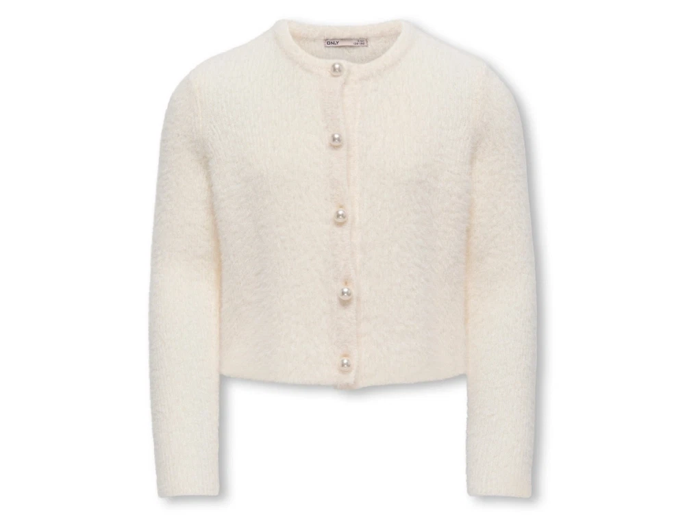 Råhvid cardigan fra KIDS ONLY i blød og fluffy kvalitet. Modellen har rund hals, lange ærmer og fine perleknapper foran, som giver et elegant og feminint udtryk. En alsidig style, der kan bruges både åben og lukket.