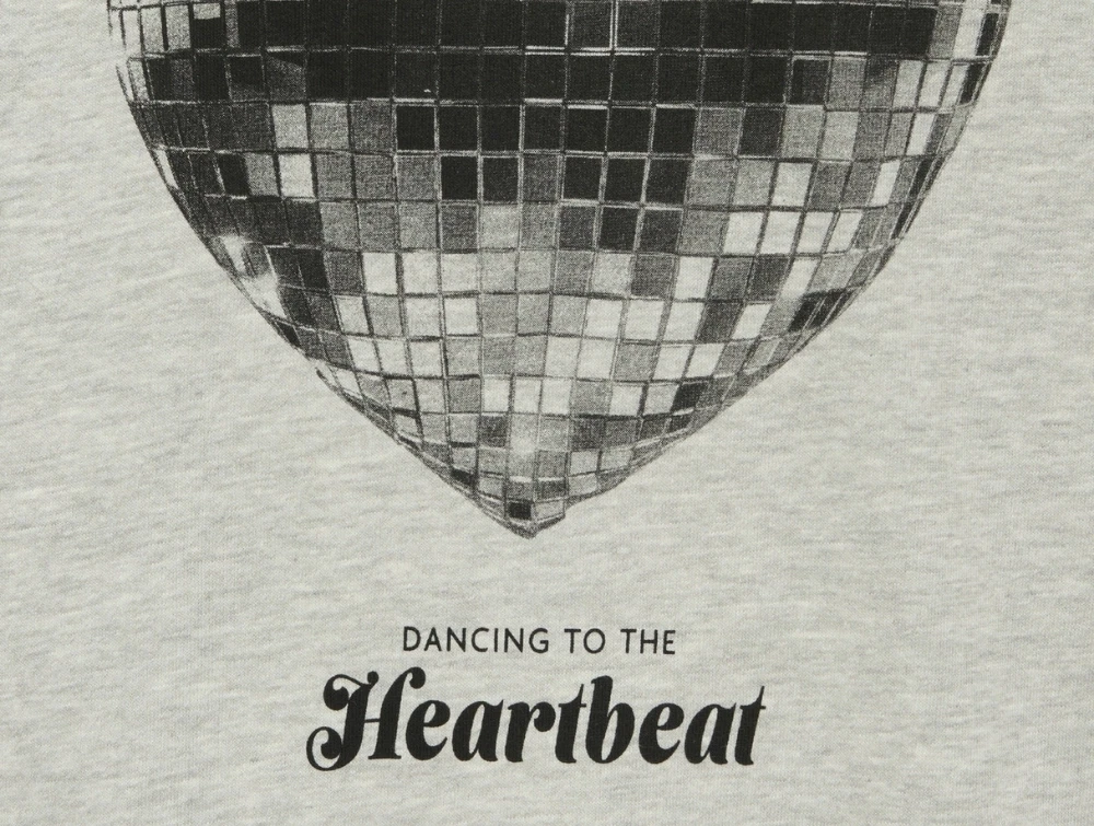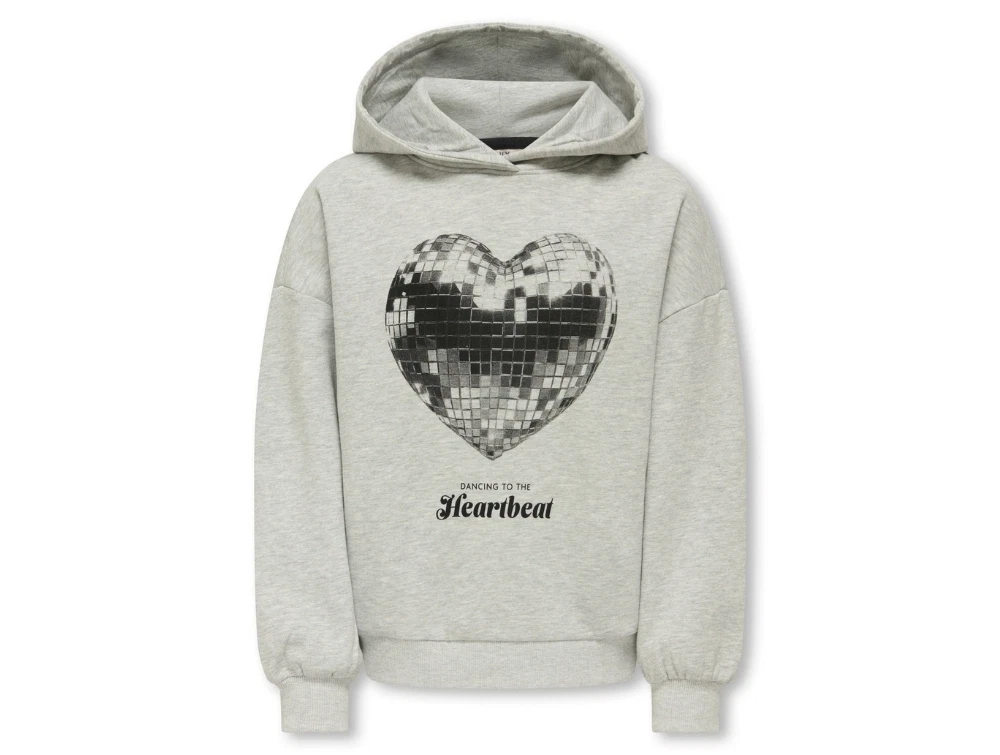 Hættetrøje i lys grå nuance (light grey melange) fra KIDS ONLY med stort sølvhjerteprint på brystet og teksten “Dancing to the Heartbeat”.