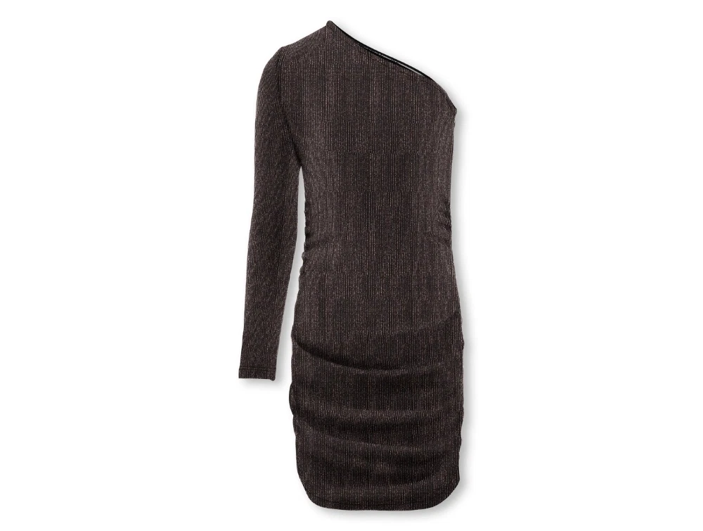 Modellen har et moderne design med én skulder, smalle ribstriber og metallisk glimmertråd, som giver et festligt skær. Stoffet er let elastisk og former sig efter kroppen.