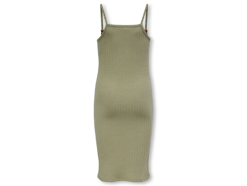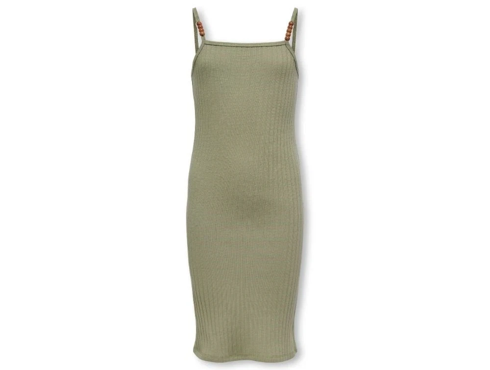kids only kjole i grøn med perledetaljer på stropper, set forfrakids only tætsiddende kjole i grøn, set bagfrapige iført grøn kjole fra kids only med perledetaljer og stroppernaerbillede af grøn ribstruktur og træperler på kids only kjole