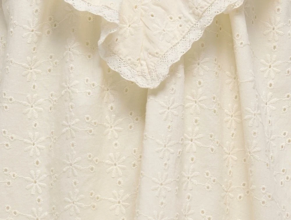 Kjolen har løs pasform og rund halsudskæring. Den lette bomuldskvalitet og broderierne gør den velegnet til både sommerdage med sandaler og til lag-på-lag med strik og strømpebukser i overgangssæsoner.