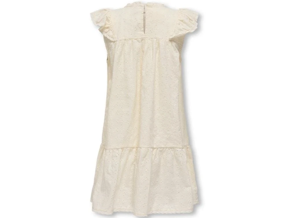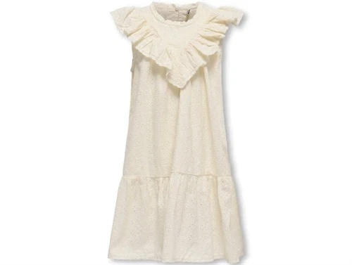 Råhvid ærmeløs kjole fra Kids ONLY i farven tofu i broderie anglaise og fine flæsedetaljer.