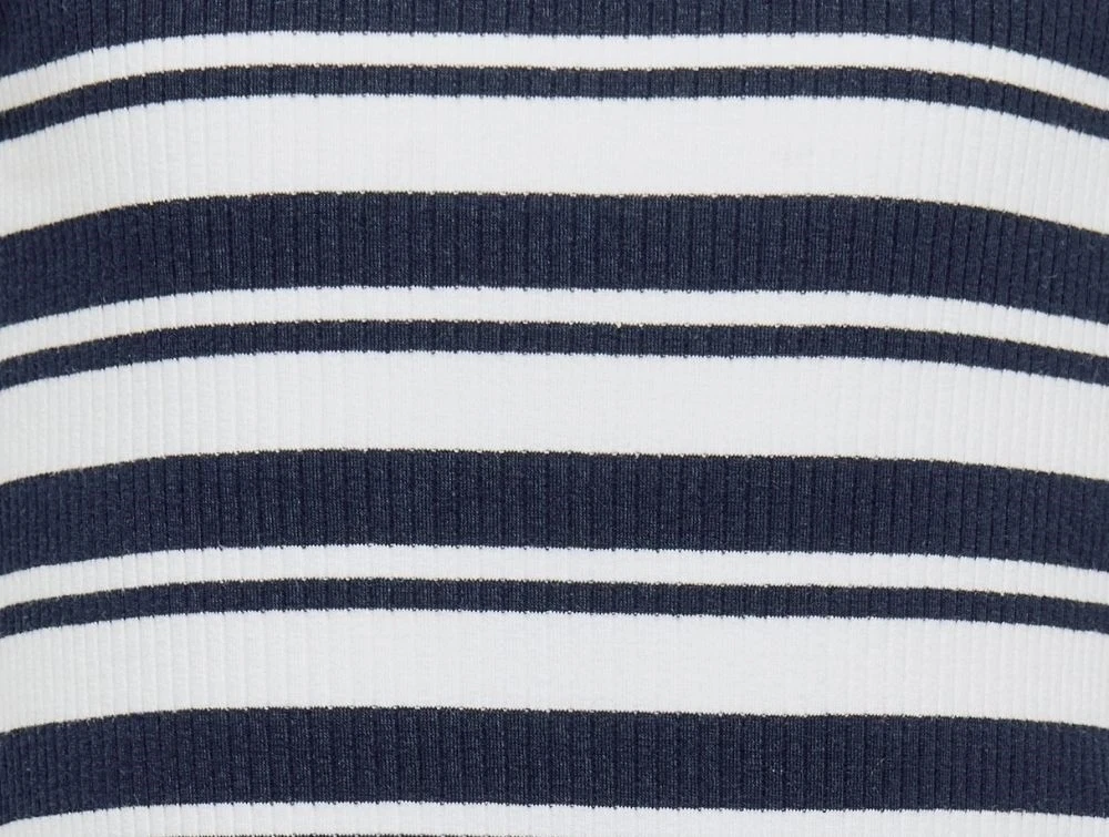 kids only lang kjole i mørkeblå og hvid med striber, set forfrakids only kjole med striber i mørkeblå og hvid, set bagfranaerbillede af ribstruktur og mørkeblå striber på kids only kjole