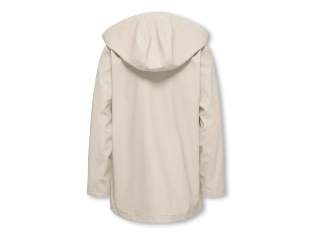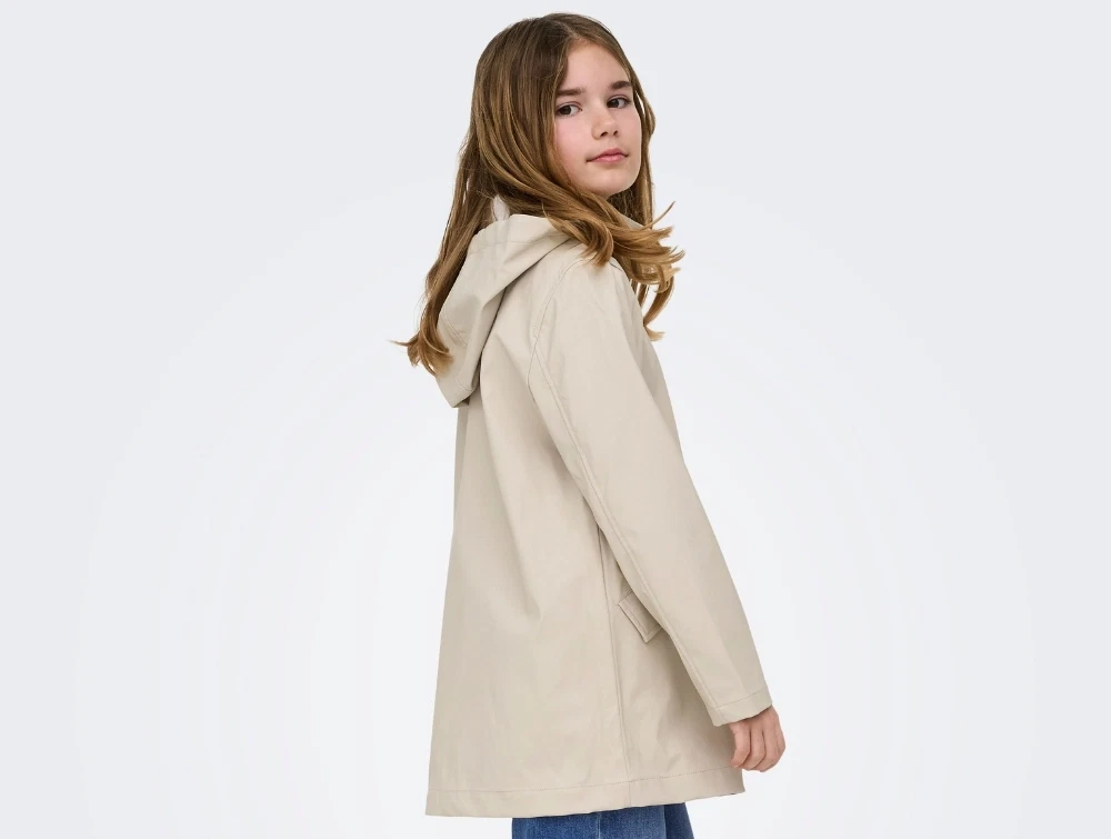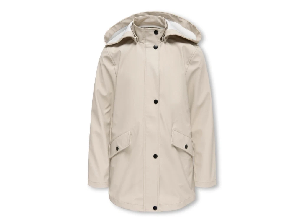 Regnjakke i lys beige nuance (silver lining) fra Kids Only med hætte og praktisk længde.