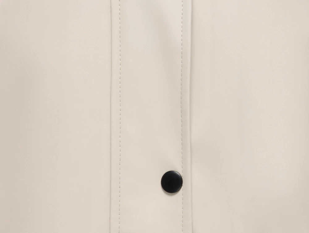 Modellen har en enkel silhuet med trykknaplukning foran og lommer med klap. Jakken er designet til regnfulde dage og giver et rent og enkelt look med almindelig pasform.