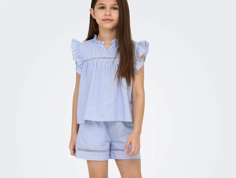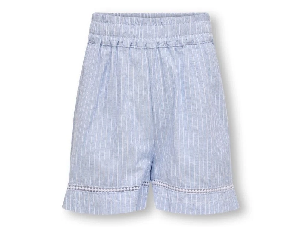 Blå shorts fra Kids ONLY med flæsedetaljer og dekorative syninger.
