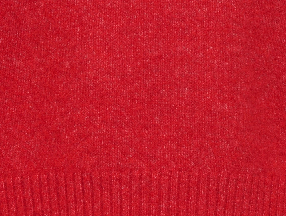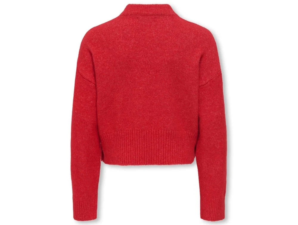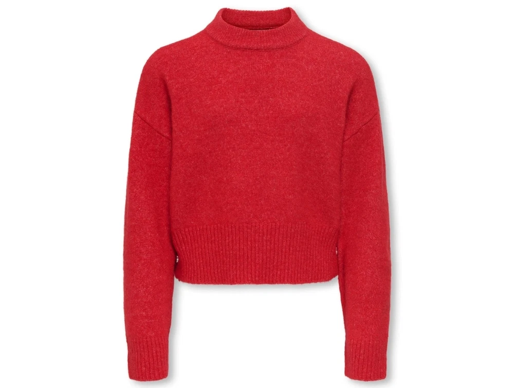 Rød striktrøje fra KIDS ONLY i farven salsa. En klassisk model i blød og lun kvalitet med høj hals og sænkede skuldre. Strikken har ribkanter ved ærmer og bund for en god pasform og et rent udtryk.