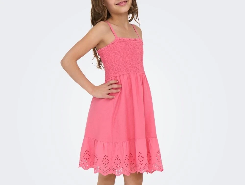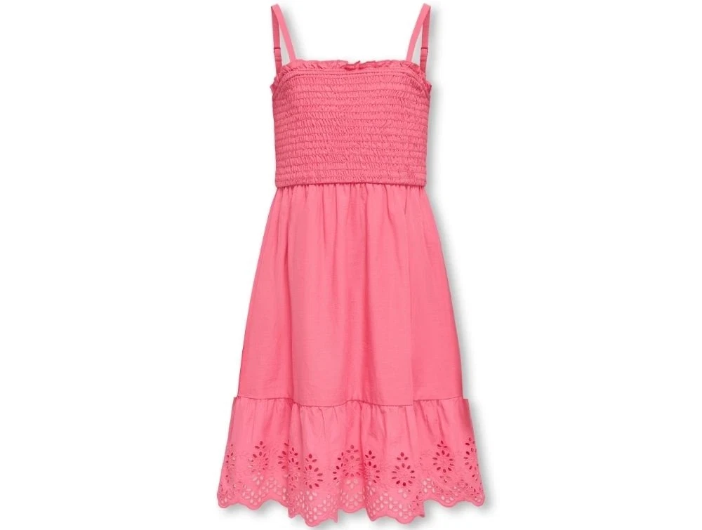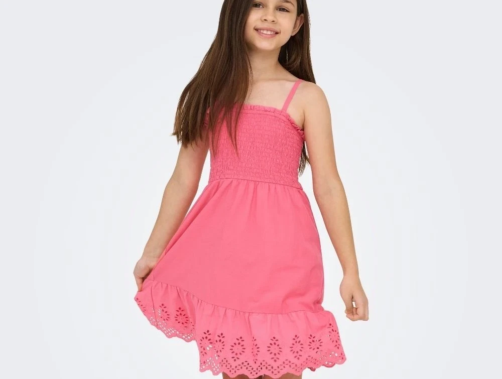 Rosafarvet smockkjole fra Kids ONLY med broderidetaljer og justerbare, tynde stropper.