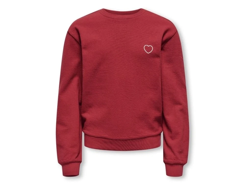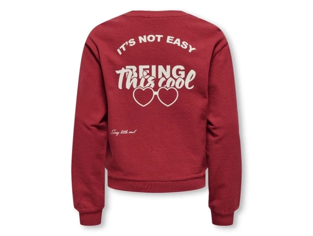 Rød sweatshirt fra Kids ONLY med lille hjerteprint foran og stort tekstprint bagpå med motiver af solbriller og statement-tekst.