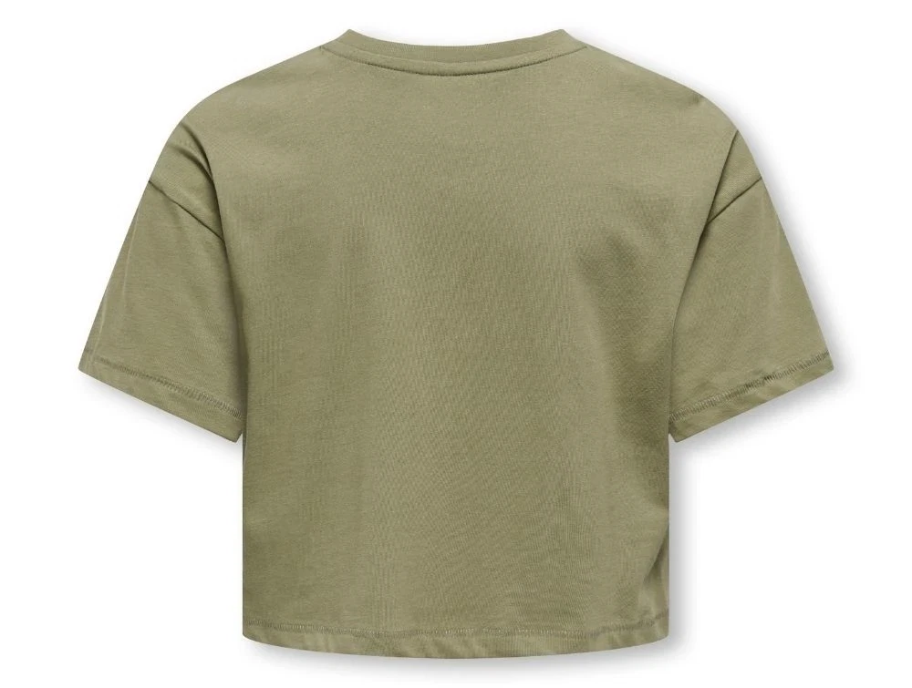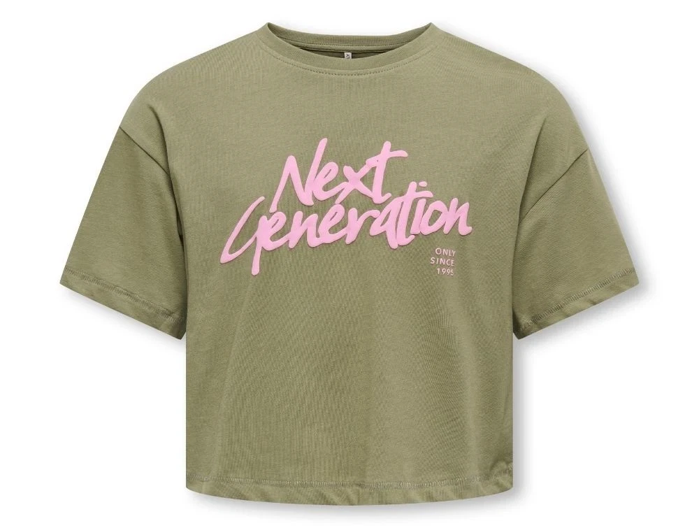 t-shirt i støvet grøn fra kids only med lyserødt tekstprint next generation på brystetbagside af støvet grøn t-shirt fra kids only med korte ærmer og rund hals
