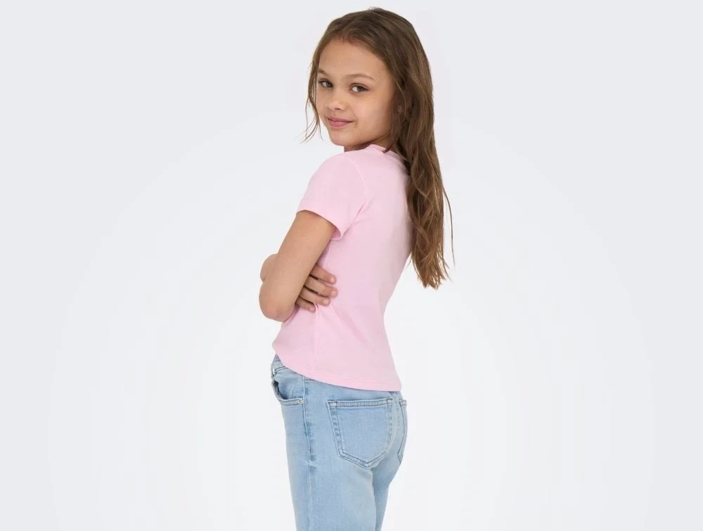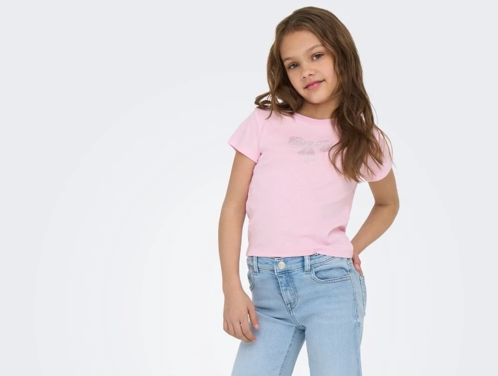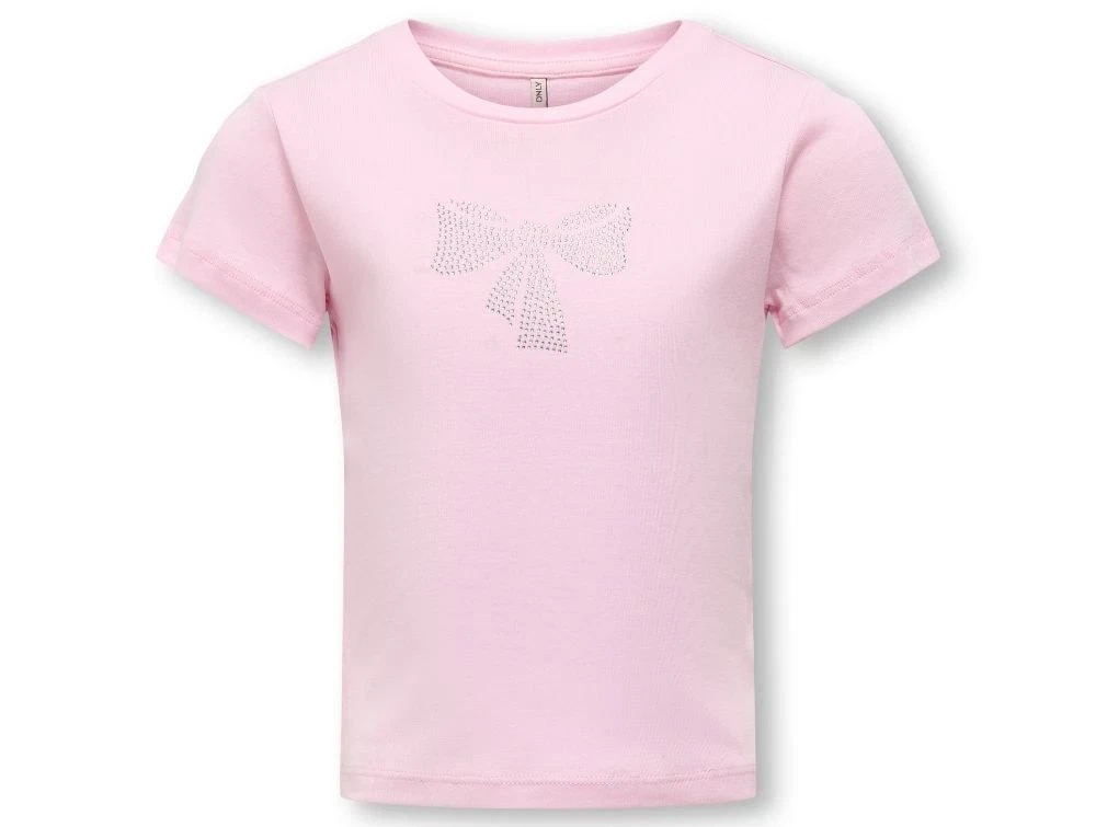 Lyserød t-shirt fra Kids ONLY med glitrende sløjfemotiv i similisten foran.
