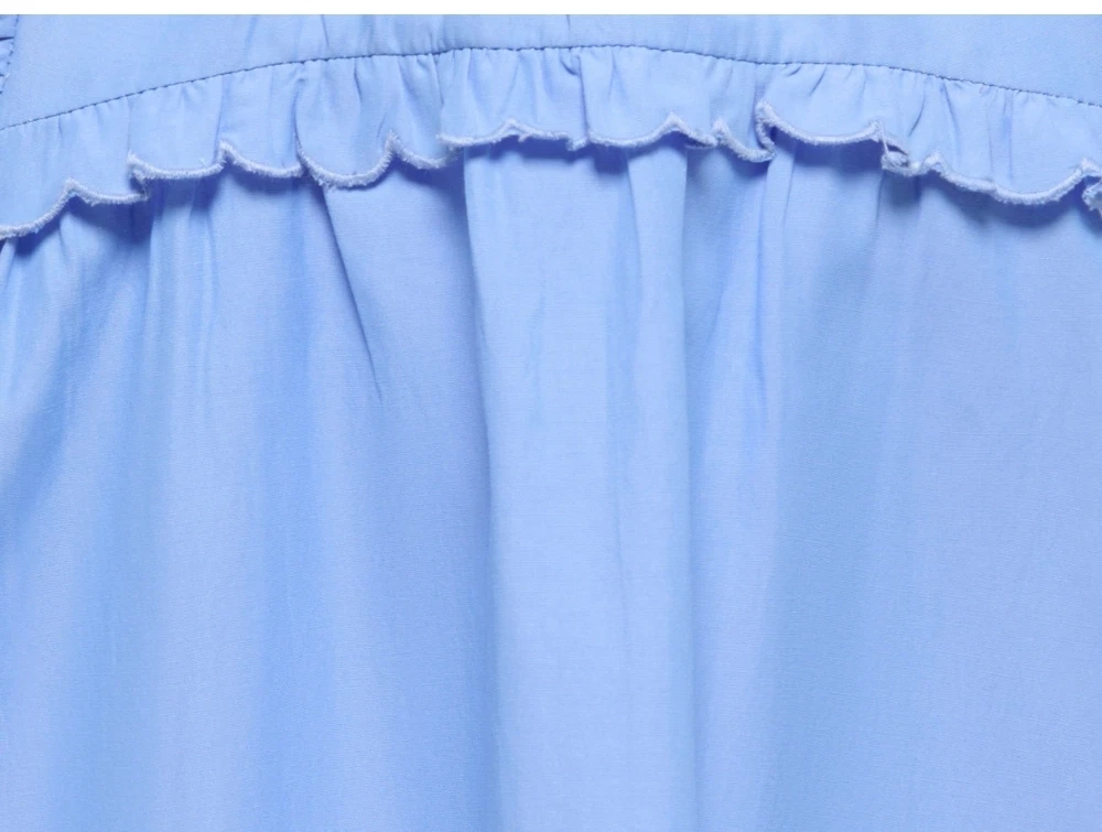 Kids ONLY top i blå med flæser ved skuldre set forfraKids ONLY top i blå med flæsedetalje closeupKids ONLY top i blå med flæser set bagfra