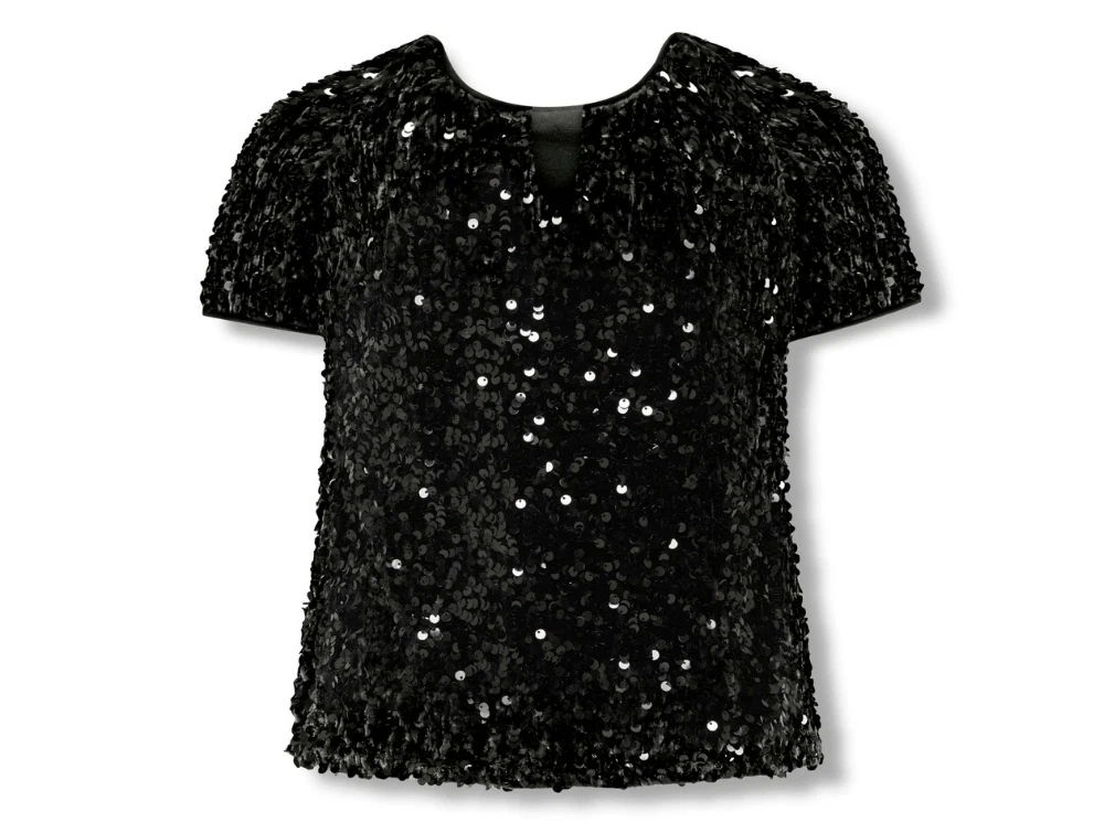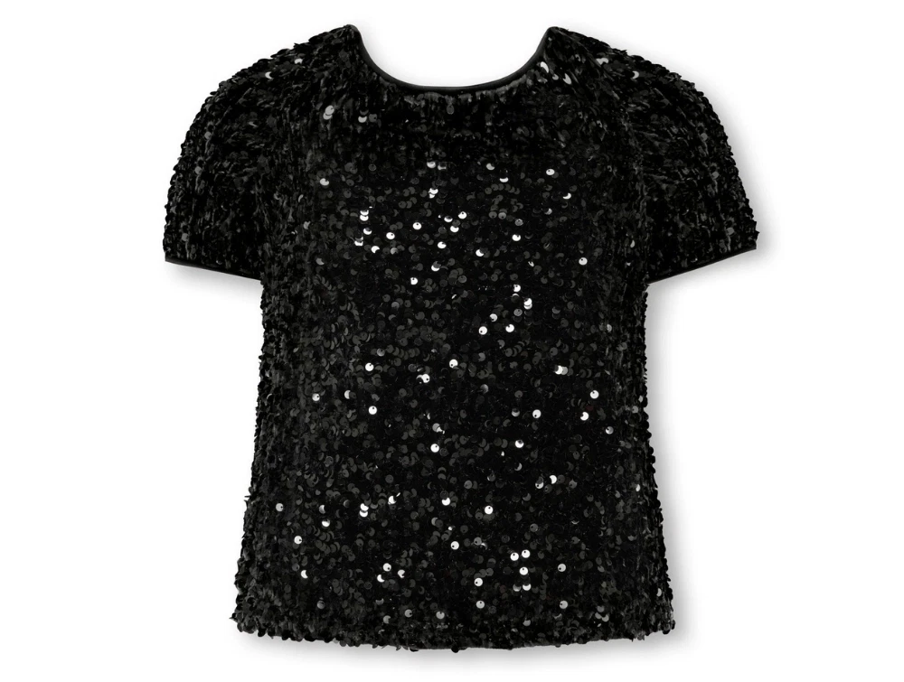Top i sort fra KIDS ONLY dækket af pailletter, der fanger lyset og giver et festligt look.