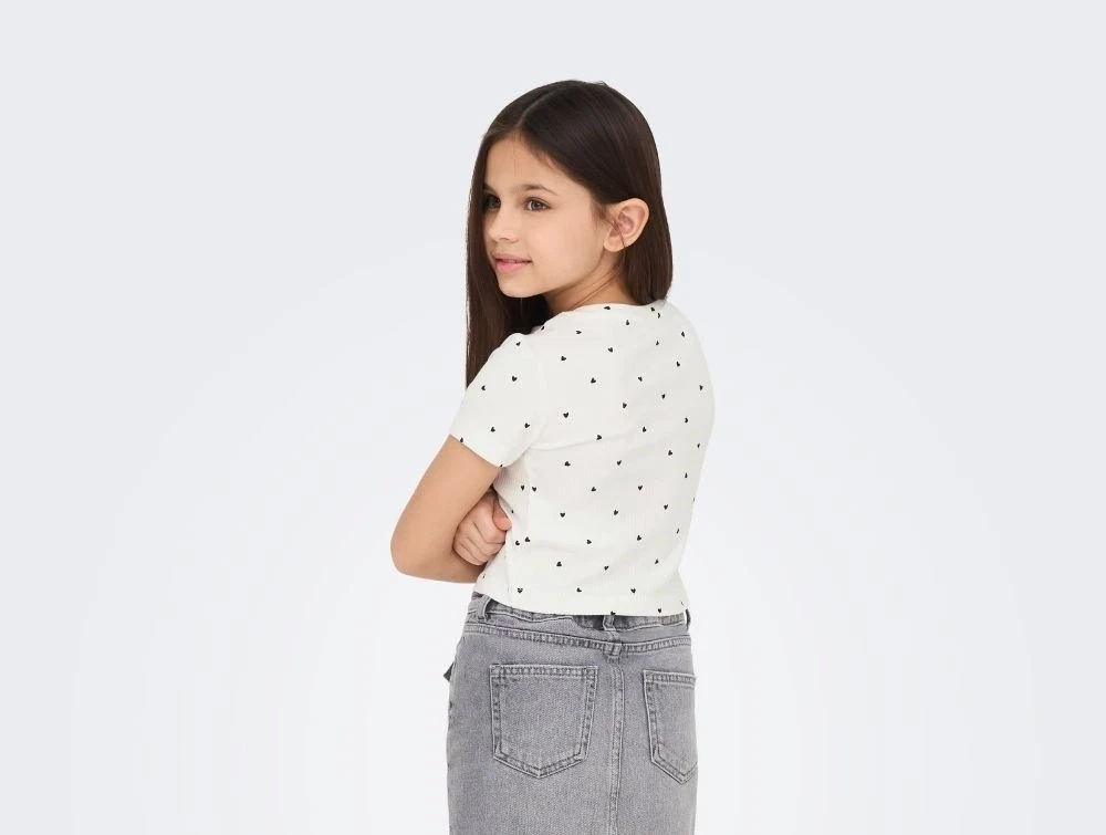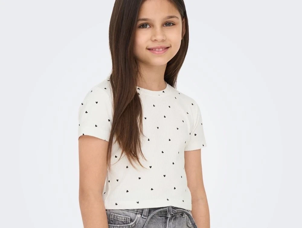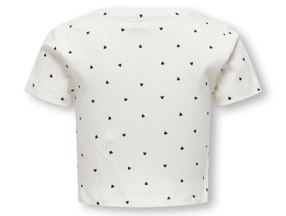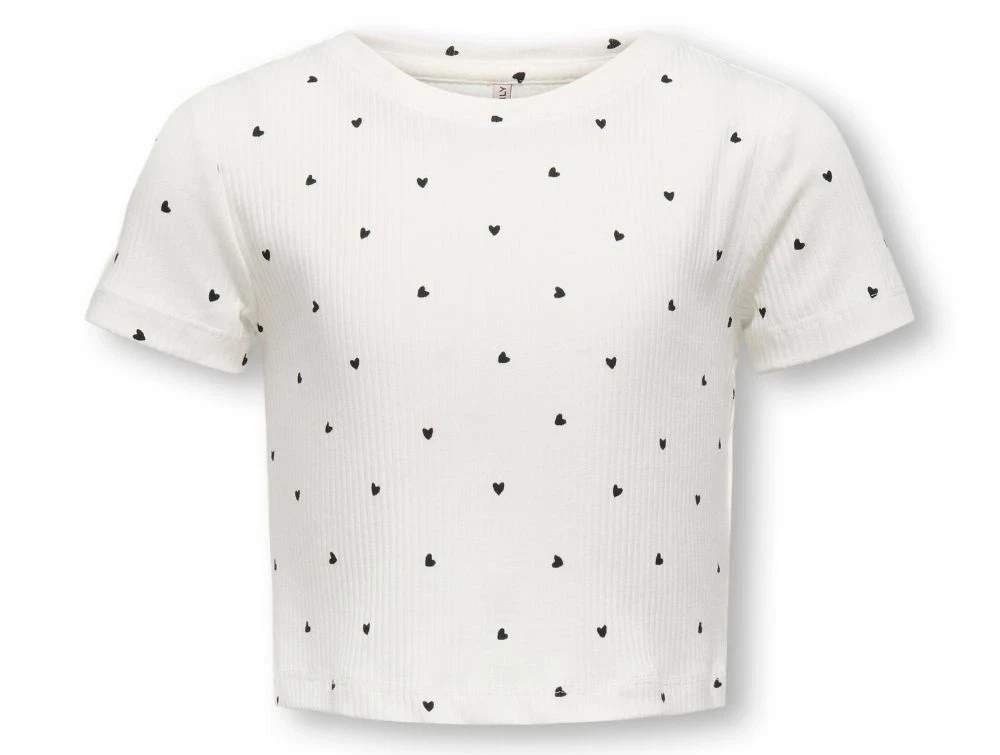 Råhvid top fra Kids ONLY i ribstrikket kvalitet med små hjerter og tætsiddende pasform.