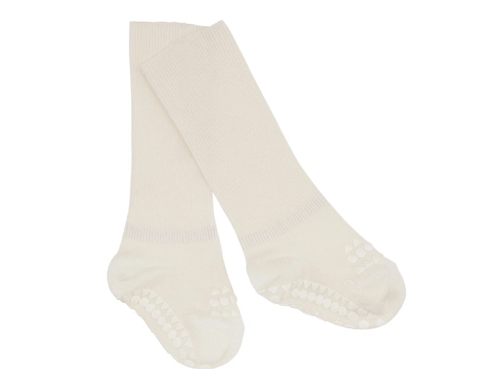 Skridsikre strømper i råhvid nuance fra GoBabyGo med blød viscose af bambus og non-slip dutter under fødderne og oven på tæerne. Strømperne er udviklet til babyer og små børn, der kravler, rejser sig og tager de første skridt på glatte gulve.