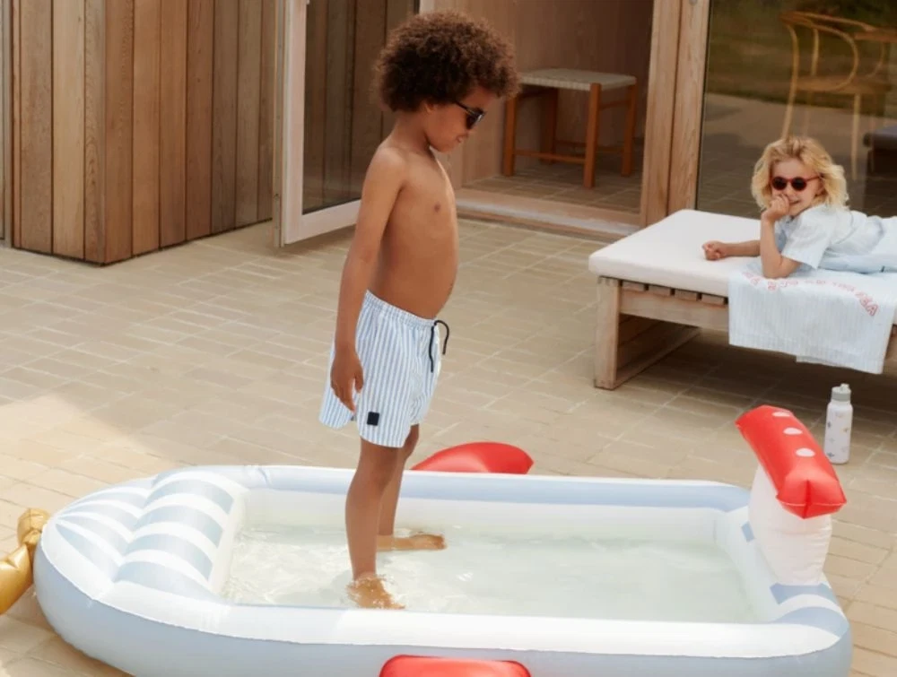De sporty badebukser har et klassisk stribet design i blå og creme og er perfekte til både strand, pool og leg i sommersolen. De er lavet i et strækbart og hurtigtørrende materiale, som sikrer komfort hele dagen.