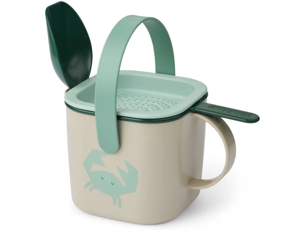 Dette sandlegesæt fra Liewood er perfekt til stranden, sandkassen og i naturen. Sættet består af en vandkande, en gennemsigtig spand, en tragt, en skovl og en si – alt, hvad dit barn behøver for timevis af leg og udforskning i sand og vand.