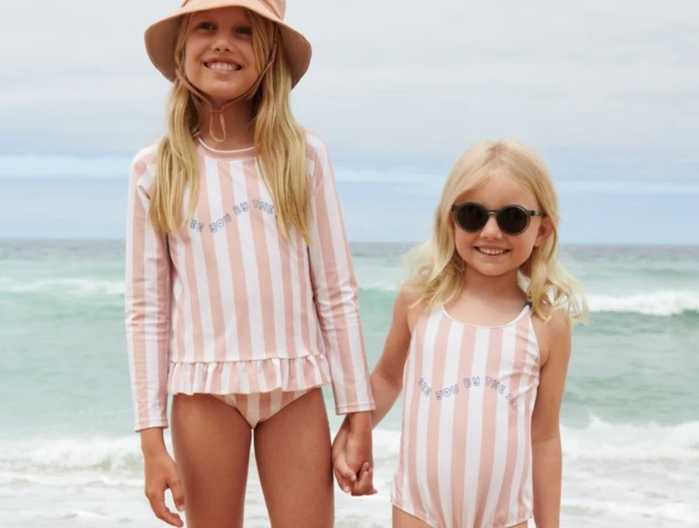 Badetøjet er fremstillet i et strækbart og hurtigtørrende materiale med UV40+ beskyttelse, hvilket gør det ideelt til solrige dage ved stranden eller poolen.