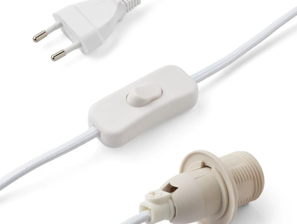 Lampen har en praktisk tænd/sluk-kontakt, en stofledning og bruger E14 LED-pærer (købes separat).