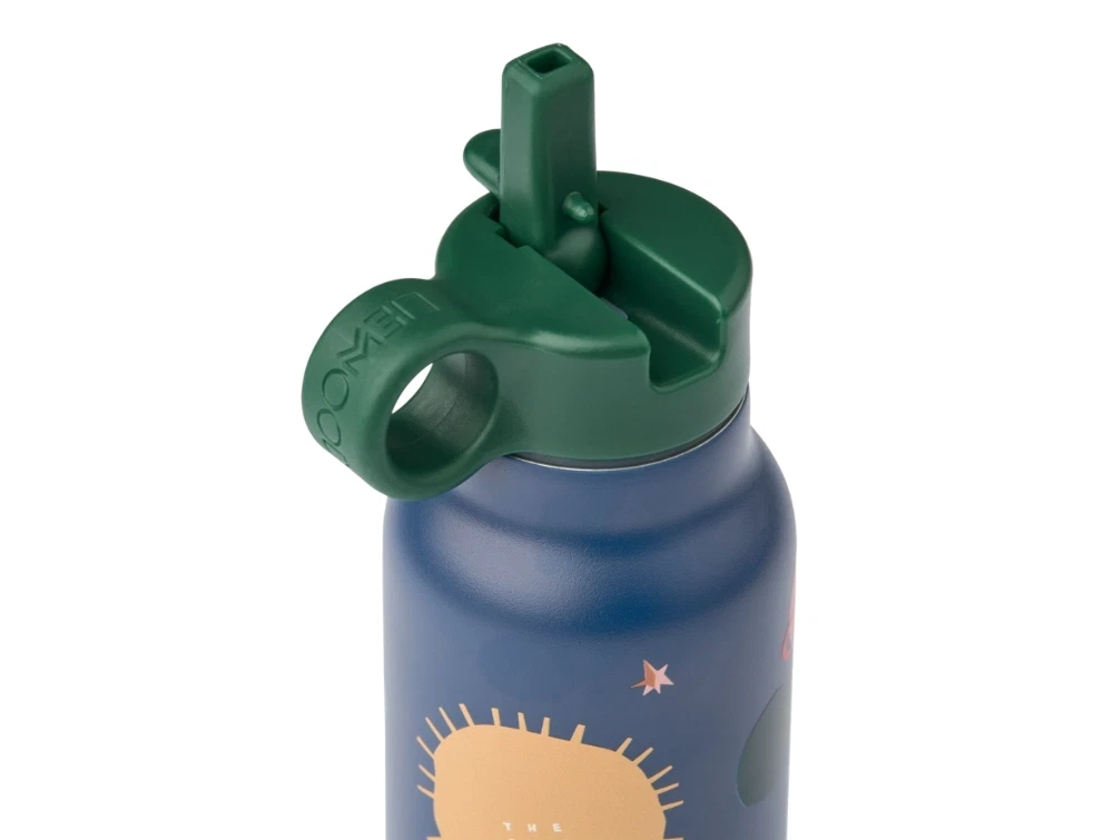 Vandflaske i mørkeblå nuance fra Liewood med ruminspireret print og grøn sugerørslåg med praktisk bæregreb.