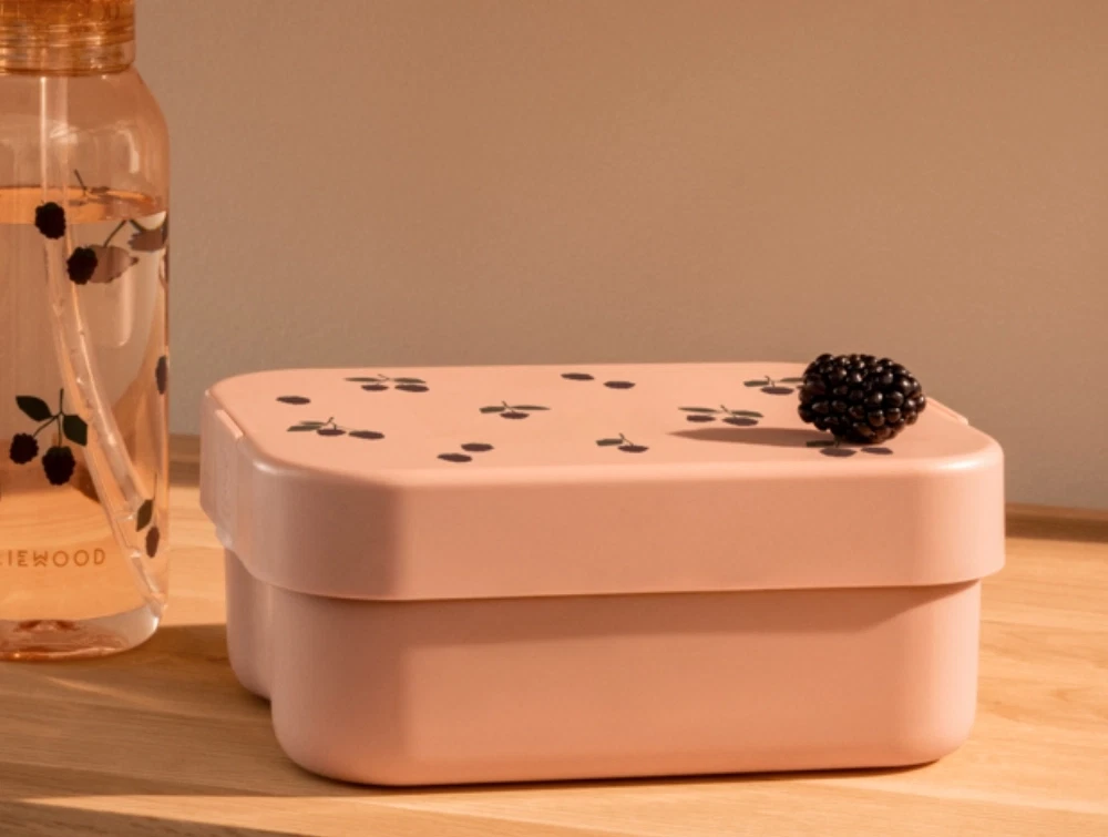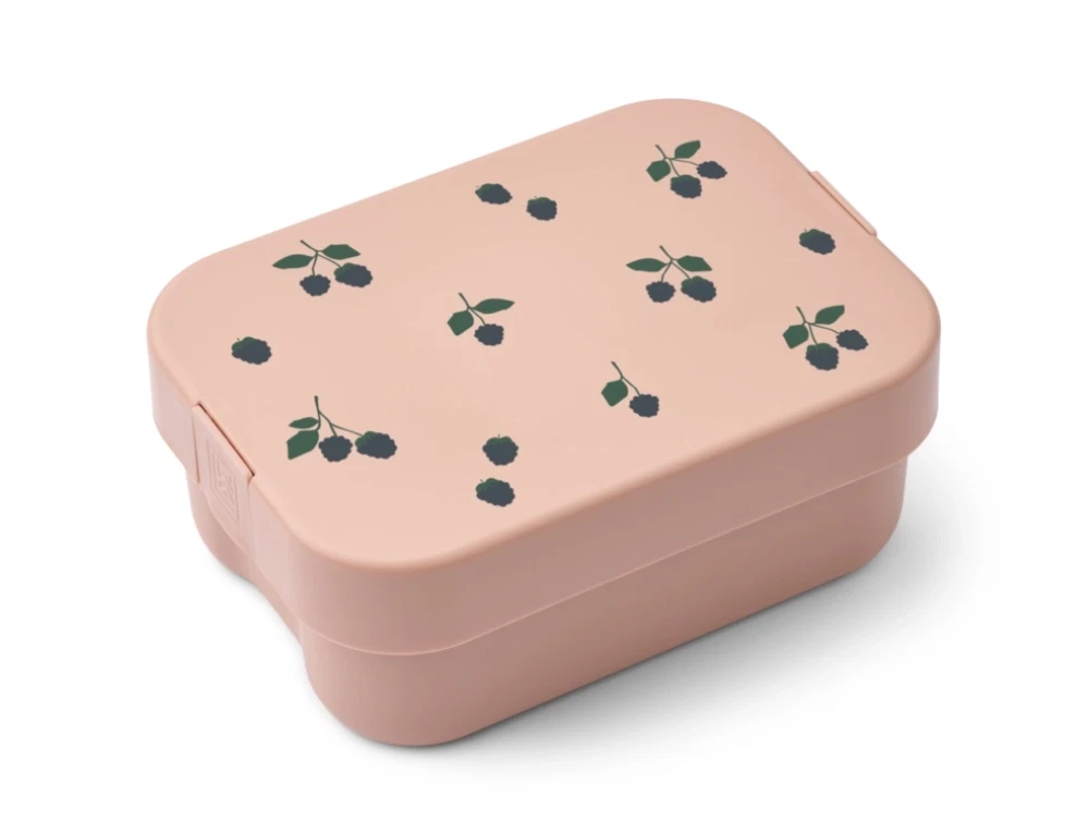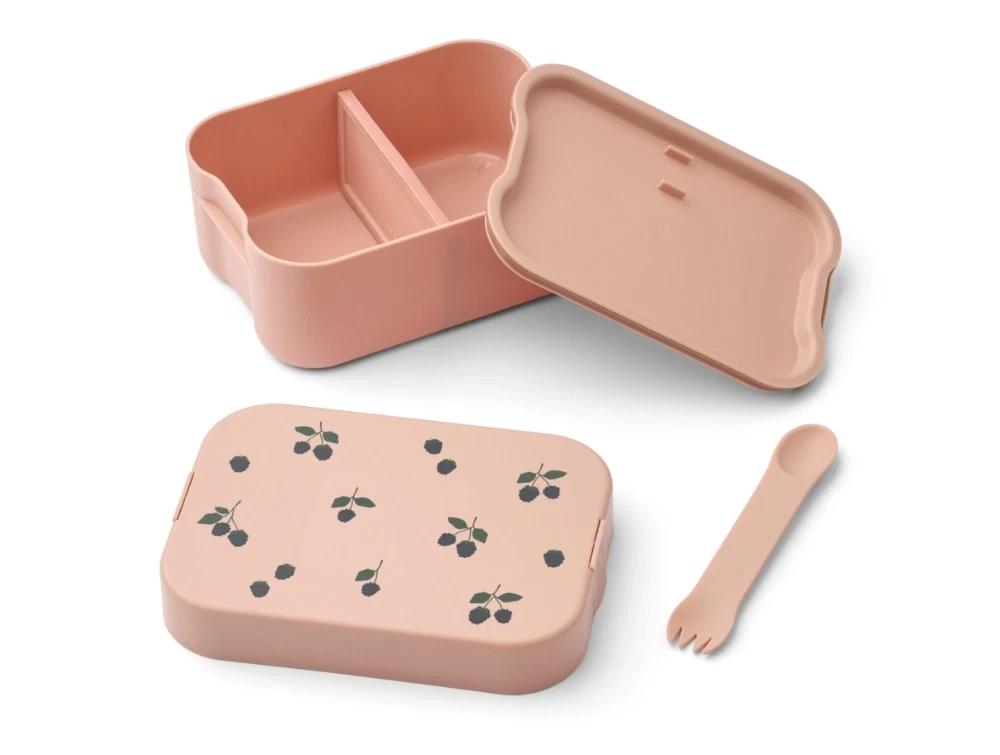 Madkasse i lyserød nuance fra Liewood. Madkassen er dekoreret med søde bærprint og kommer med tilhørende ske/gaffel-bestik.