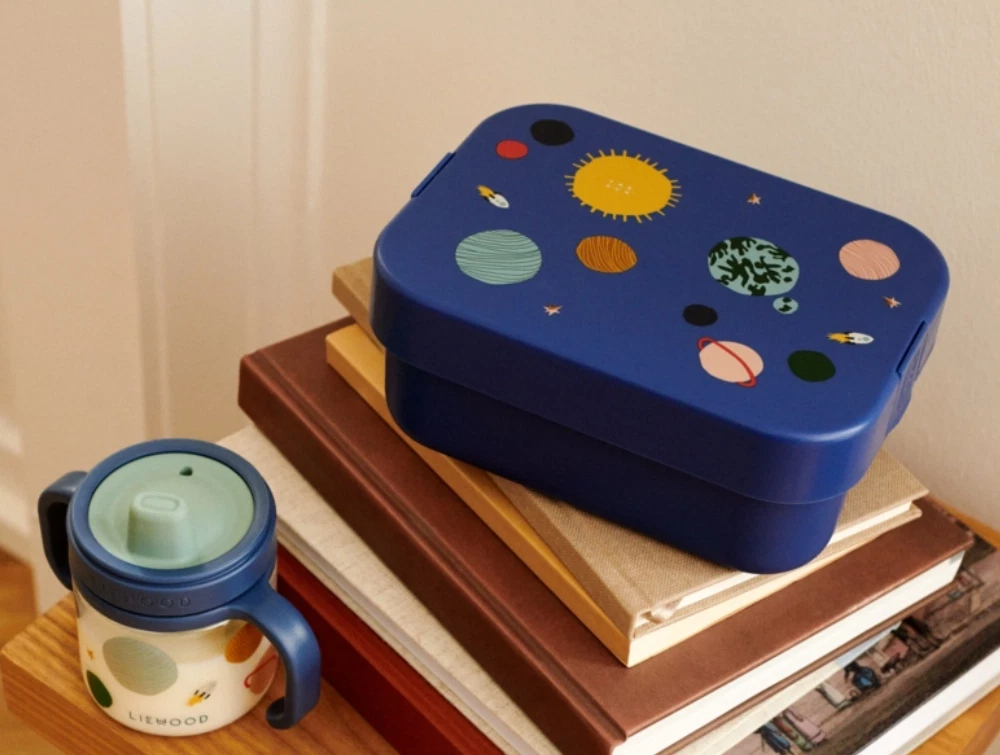 Blå madkasse fra Liewood. Madkassen er dekoreret med sjove rum- og planetprint og kommer med tilhørende ske/gaffel-i-én bestik.