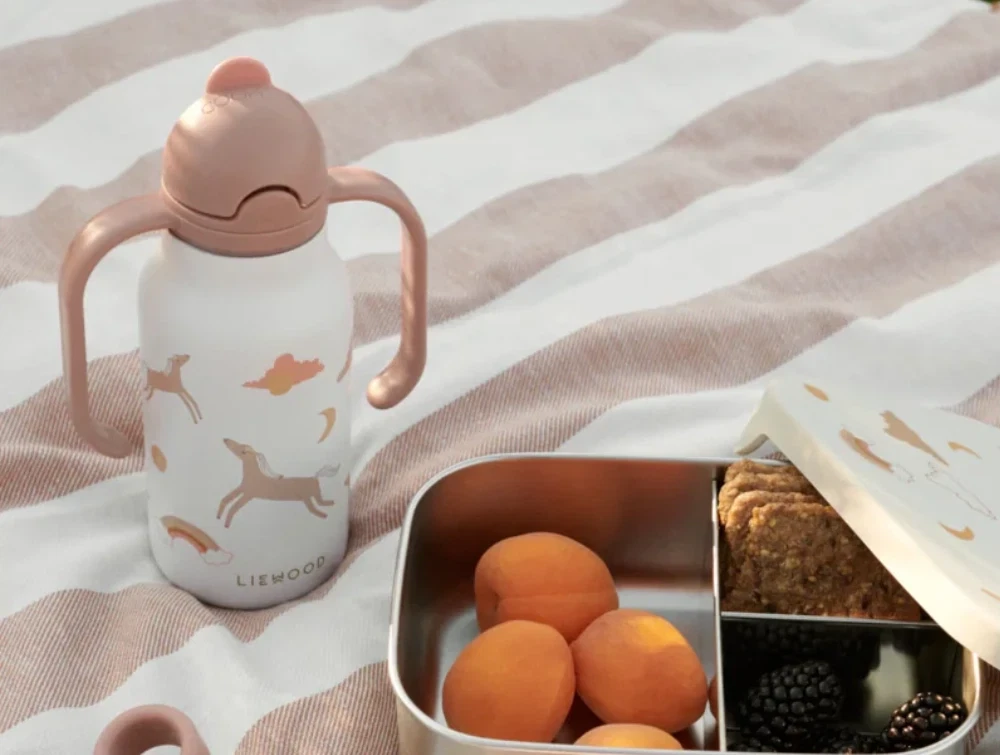Flasken har et praktisk låg med to håndtag og indbygget sugerør, så barnet nemt kan drikke uden at vippe flasken. Den holder væsker kolde i op til 12 timer og varme i op til 6 timer – perfekt til både hverdag og udflugter.