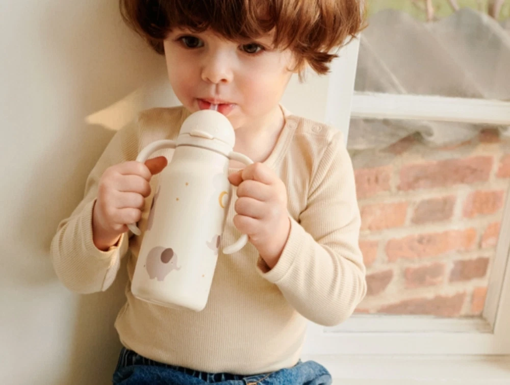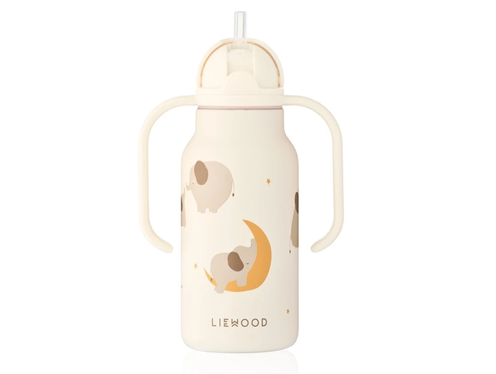 Vandflaske i cremefarvet nuance fra Liewood med sødt elefantprint og praktiske håndtag, som gør den nem for små børn at holde.