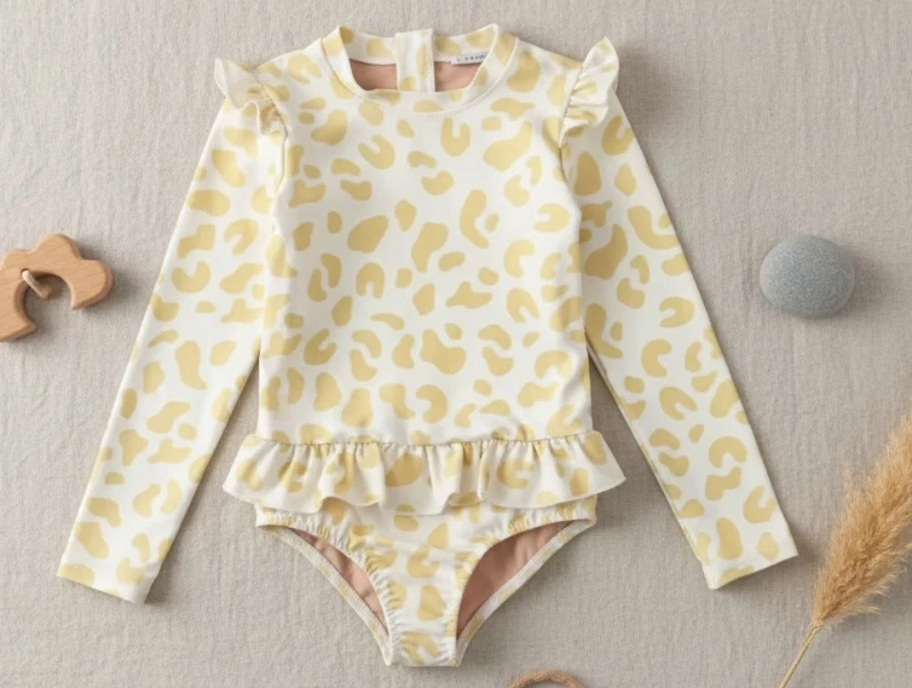 Langærmet badedragt med flæser om livet og på skuldrene i farven leo jojoba fra Liewood.