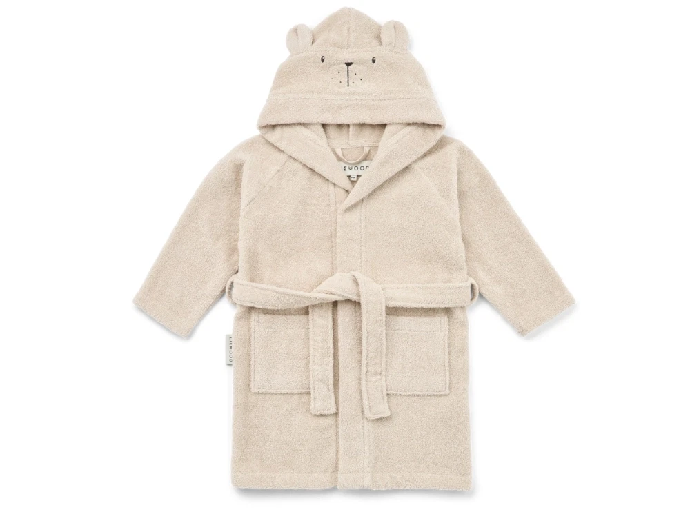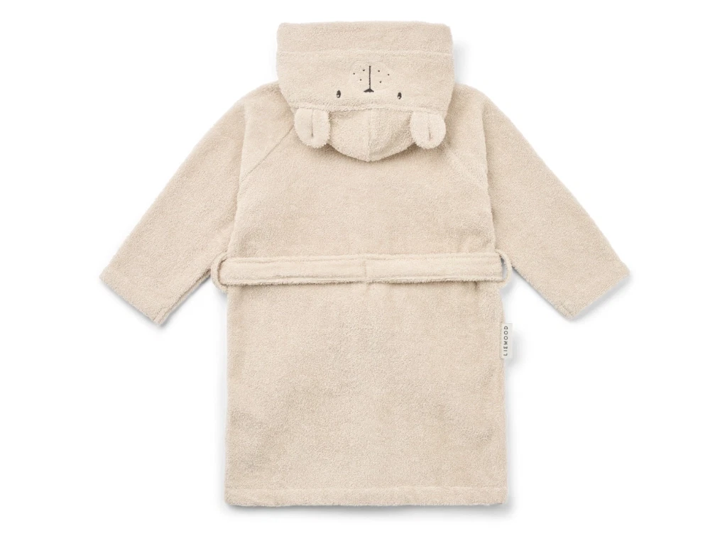 Lily isbjørn badekåbe fra Liewood i råhvid nuance (sandy). Badekåben er lavet i blød frotté af bomuld og har en hyggelig hætte med broderet isbjørneansigt og små ører. En behagelig badekåbe til de mindste, der giver varme efter badet.