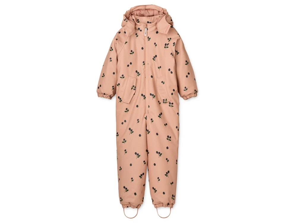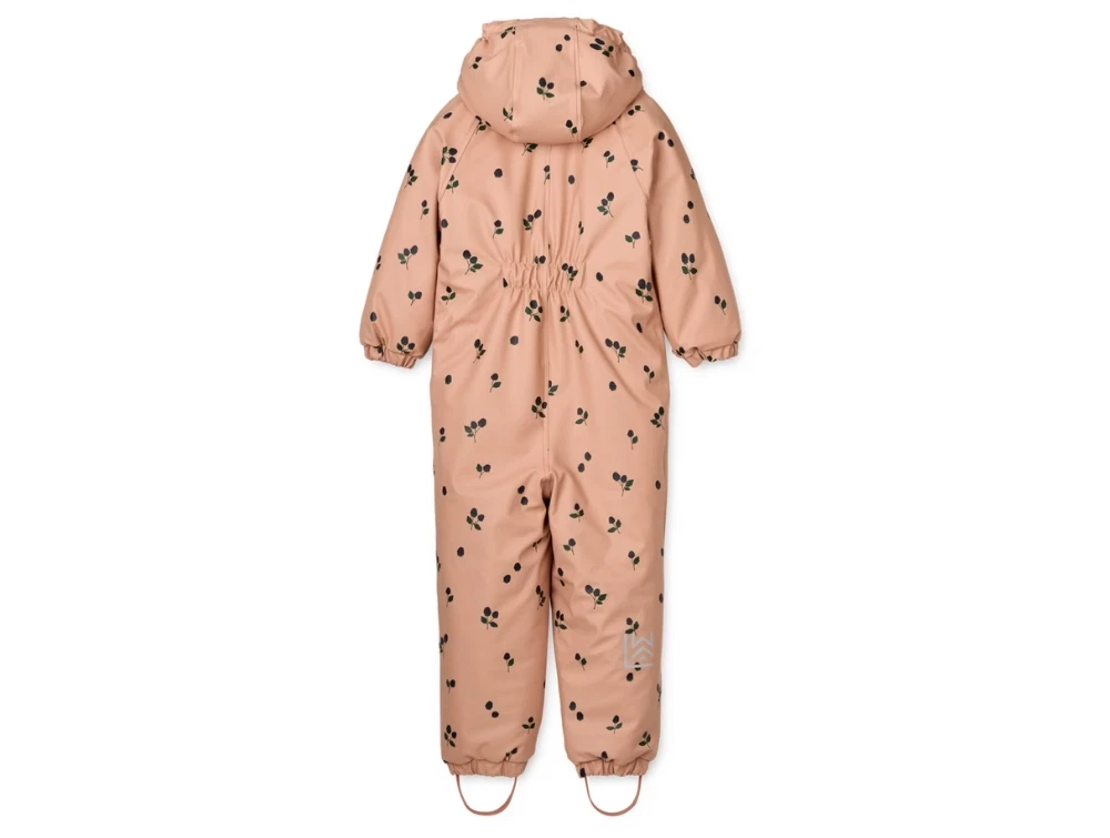 Maddy gummiflyverdragt/regndragt fra Liewood i rosa nuance med bærprint (berry / pale tuscany). Dragten er lavet i PU-belagt materiale med gummi og fungerer som en varm regndragt med ben og ærmer, der beskytter effektivt mod regn og fugt. Pasformen er almindelig og giver god bevægelsesfrihed. Dragten kan bruges som "let" flyvedragt, da den har Thermolite isolering, som er et alternativ til dunpolstring.