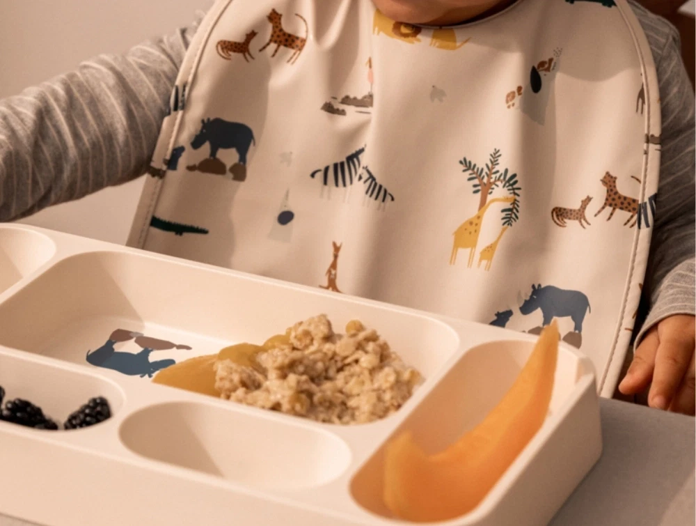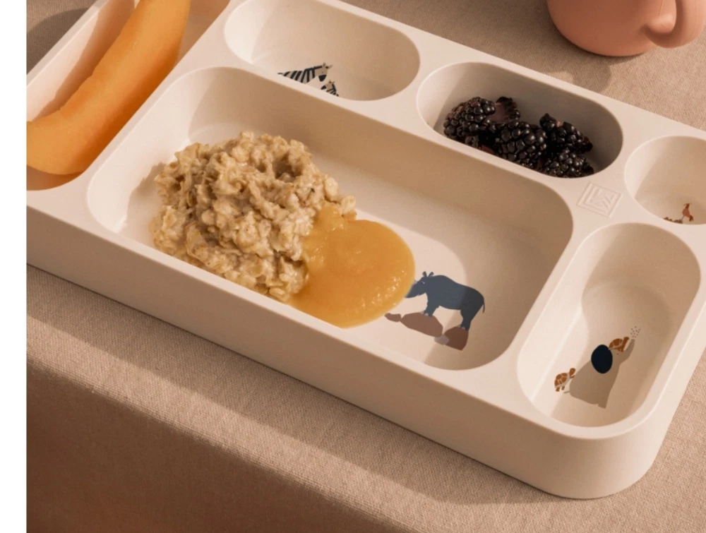 Opdelt tallerken i beige nuance fra Liewood med farverigt dyreprint.